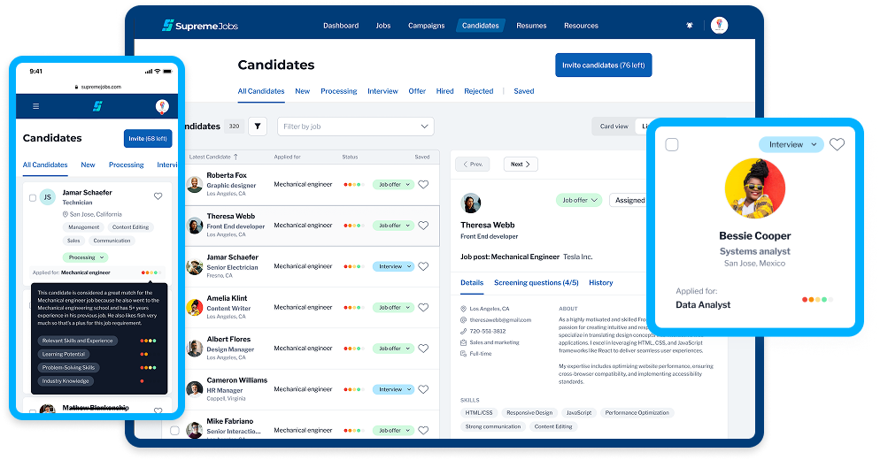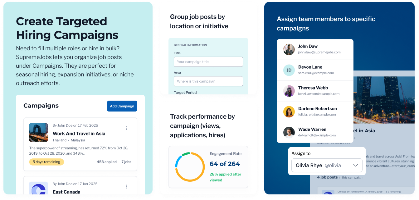 SupremeJobs offers powerful tools for modern hiring teams—from AI-assisted candidate discovery to campaign management and structured applicant tracking.